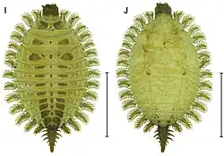 The larvae are distinctive being described by Gordon Floyd Ferris in 1927 and Blair in 1930 as being "entomological enigmas". They were not associated with the adult beetles until 25 years after their discovery by Barber in 1905. They are ovate and flattened and have moderately long, lateral lobes lined with elongated feathery lobules on all the thoracic segments and the first eight abdominal segments. The head and the posterior abdominal segments are relatively small and dark-coloured.[2] The larvae are ambush predators that use their bodies to pin invertebrate prey, on which it then feeds using its sucking mandibles. Larval specimens of the Australian Brachypsectra species have been found in leaf litter and under bark. The larvae pupate inside a silken coccoon which they construct, with pupation lasting around six weeks. The adults of Brachypsectra appear to be short-lived relative to the larvae.[3]