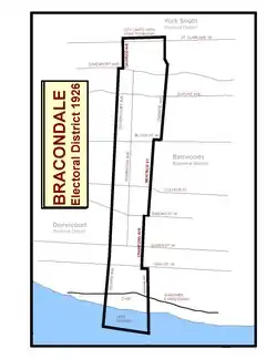 Bracondale was the name of a former Toronto suburb that was annexed by the city in 1909;[2] and north of Davenport Road, constituted the northern part of what eventually became the provincial electoral district. It was part of the northwestern expansion of the city that included Wychwood Park, and the City of West Toronto (now known as The Junction).[2] The constituency was first contested during Ontario's 17th general election on 1 December 1926.[3]Arthur Russell Nesbitt, was elected its first Member of the Legislative Assembly (MLA).[4] He was a member of Ontario Conservative Party.[4]