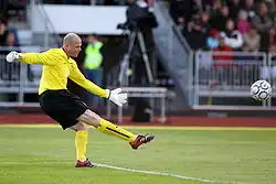 Friedel is also officially Aston Villa's oldest-ever player, a record he set on February 1, 2011, by playing in the club's Premier League fixture away at Manchester United. Friedel's age of 39 years and 259 days surpassed the previous record held by Ernie Callaghan, who last played for Villa against Grimsby Town in April 1947, aged 39 years and 257 days.[4] Friedel's last appearance for Villa was on May 22, 2011, in a 1–0 home win against Liverpool, aged 40 years and four days.[5]