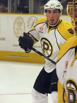 After the Mooseheads' loss in the QMJHL playoffs, the Bruins told Marchand that, rather than joining the team for the remainder of their season, he would be invited to summer training camp. Marchand was frustrated with the decision, which was rumoured to be due to his on-ice attitude, and he entered the Bruins' 2008 training camp looking to rebuild his reputation and establish himself as a strong player.[6] He played the 2008–09 season with the Providence Bruins, Boston's American Hockey League (AHL) affiliate, where he finished second in scoring among all AHL rookies with 18 goals and 41 assists in 79 games. That scoring continued into the playoffs, where Marchand added another seven goals and eight assists in 16 games.[23] The Providence Bruins advanced to the final four of the 2009 Calder Cup playoffs, where they were eliminated by the eventual Calder Cup-winning Hershey Bears.[24]