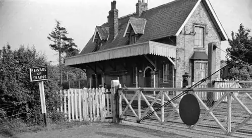 Bradfield railway station served the village of Bradfield in Essex. It was on the Manningtree to Harwich branch line, which is today known as The Mayflower Line.[2] It closed in 1956. Consisting of just two through platforms it had no sidings for working local goods traffic, which was the normal scenario in rural East Anglia.[3] The station buildings on the up platform were particularly splendid for a very small station and were captured by the well known and popular transport artist Malcolm Root FGRA.[4] The facilities on the down platform were very modest by comparison. The station had a very restricted catchment area and with a local population of just 730 in 1901 and 811 in 1961, passenger numbers were always very limited.[5] A level crossing at the west end of the station was controlled by a signal box on the up side with just 12 levers.[6]