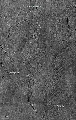Bradgatia linfordensis is a petalonamid, consisting of up to six or more fronds, which radiates from a central anchor point, or holdfast, at its base. As such, it has been likened to a compressed cabbage. The fronds themselves are regularly spaced out from one another suggesting that Bradgatia was fairly rigid, and which could grow up to 300 mm (11.8 in) in height, towering over some of the smaller petalonamids around it.[2][1]