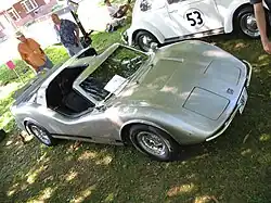 The GT II was described as a "Luxury Sports Car Kit" in its knock-down form, although it could be had as a turn-key car as well. Even though still based on a VW Beetle chassis, the GT II was a much more sophisticated vehicle than the earlier GT.[12] New features included true gull-wings doors with frames, sliding safety glass in the doors and interior door releases with gas struts, a lower sill to ease ingress and egress, improved bumpers and steel reinforcing in the roof. The retractable headlamps were now electrically driven. The interior was much roomier, with custom seats able to comfortably accommodate passengers over 6 feet in height. Instrumentation was provided by a set of VDO Jet Cockpit gauges.[15]