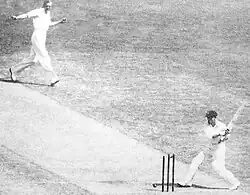 At this point, Bradman had played fifteen Test matches since the beginning of 1930, scoring 2,227 runs at an average of 131.[62] He had played eighteen innings, scoring ten centuries, six of which had extended beyond 200.[62] His overall scoring rate was 42 runs per hour,[63] with 856 (or 38.5% of his tally) scored in boundaries.[62] Significantly, he had not hit a six,[62] which typified Bradman's attitude: if he hit the ball along the ground, then it could not be caught. During this phase of his career, his youth and natural fitness allowed him to adopt a "machine-like" approach to batting. The South African fast bowler Sandy Bell described bowling to him as, "heart-breaking ... with his sort of cynical grin, which rather reminds one of the Sphinx ... he never seems to perspire".[64]
