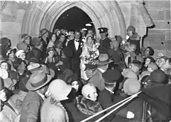 Bradman's chaotic wedding to Jessie Menzies in April 1932 epitomised these new and unwelcome intrusions into his private life. The church "was under siege all throughout the day ... uninvited guests stood on chairs and pews to get a better view"; police erected barriers that were broken down and many of those invited could not get a seat.[64] Just weeks later, Bradman joined a private team organised by Arthur Mailey to tour the United States and Canada.[68] He travelled with his wife, and the couple treated the trip as a honeymoon. Playing 51 games in 75 days, Bradman scored 3,779 runs at 102.1, with eighteen centuries. Although the standard of play was not high, the effects of the amount of cricket Bradman had played in the three previous years, together with the strains of his celebrity status, began to show on his return home.[69]