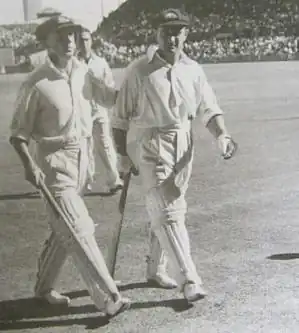 Commenting on Australia's victory, the team's vice-captain Vic Richardson said, "... we could have played any team without Bradman, but we could not have played the blind school without Clarrie Grimmett".[57] A modest Bradman can be heard in a 1930 recording saying, "I have always endeavoured to do my best for the side, and the few centuries that have come my way have been achieved in the hope of winning matches. My one idea when going into bat was to make runs for Australia."[58]