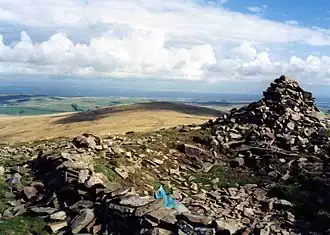 The top of the fell is strewn with a few boulders and there is a fair sized cairn which is a landmark for several kilometres around. The view from the summit is one of the finest in the Northern Fells, with the panorama north taking in the Solway Firth, Scottish Borders and the northern Pennines.