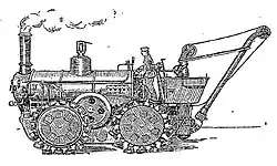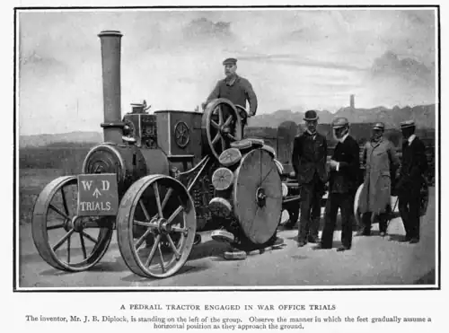 This desire for greater traction in road locomotives (traction engines) probably led directly to the pedrail system which he patented in 1899.[9] In this design the continuously laid tracks contain rollers and the rails roll over them, which gave it the capability for crossing banks and ditches, as well as soft ground; a capability that attracted the attention of the War Office. The practical realisation of this was the Pedrail Tractor made by Fosters of Lincoln, from which an account in 1904 of a trial attended by members of the War Office proved its ability to tow a heavy load over rough ground, climbs hills and turn with ease, and show a 2 ton drawbar pull.[10]