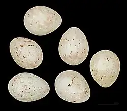 Bramblings first breed when they are one year old. The nest is usually placed high in a tree against the trunk. It is built by the female and consists of an outer layer which may contain lichen, grass, heather, cobwebs and strips of bark from birch or juniper trees. It is lined with feathers, soft grass and hair. The eggs are laid at daily intervals. The clutch usually contains 5–7 eggs. They range from light blue to dark olive-brown and have pink to rusty red spots and blotches. On average they measure 19.4 mm × 14.5 mm (0.76 in × 0.57 in) and have a calculated weight of 2.14 g (0.075 oz). Starting after the last egg has been laid, they are incubated by the female and hatch after 11–12 days. The young are fed and cared for by both parents and fledge after 13–14 days. Often only one brood is raised each year but two broods can be raised in northwest Russia.[16]