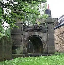 During the Railway Mania period in which the tunnel was constructed, the powerful landowners often had a strong influence on the railways being built on their land, and it was due to the demands of William Rhodes of the adjoining Bramhope and Creskeld Halls that the north portal is to an intricate Gothic revival castellated design; it was not simply an entrance and exit for trains, but a fantasy medieval gatehouse garden feature.[21] After it was finished, was lived in for a while by railway workers.[14] It is built of rock–faced sandstone and has three side towers with turrets. The keystone on its horseshoe–shaped archway features a portrait of a bearded man thought to be Rhodes. Its crenellated parapet has a carved cartouche in the centre featuring a wheatsheaf, fleece and fish[6] – the heraldic device of the Leeds and Thirsk Railway.