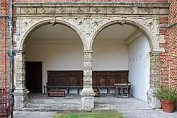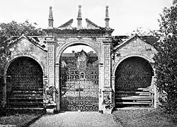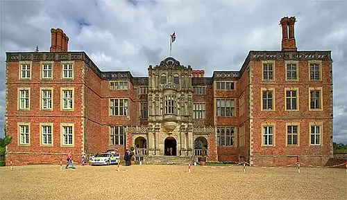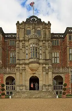 The north façade has three bays separated by windows and features a loggia, typical of early 17th-century houses, with a central arched entrance to accommodate coaches.[42] The central bay is crowned by an ornamental pierced parapet below a niched Dutch gable, which shelters a small statue of Lord Zouche[42][45] or James I.[46] There are small obelisks at either side of the gable.[28] Thorpe originally intended the main entrance of the house to be on this side, building on the gatehouse of the earlier Foxley house.[47]