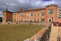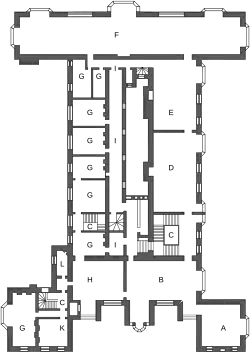 The building stands on the edge of a plateau, overlooking the park to the south.[44] The plan of the house is unusual, partly because of its incorporation of the earlier building; it extends at right angles to the primary (southern) façade.[42] The elevations are symmetrical, facing outwards, but the interior court is narrow, and projecting wings lie at either end of the eastern and western sides.[28]
