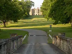 The main avenue approaches from the southwest, through an arched gateway formed by two Grade II listed early 19th-century lodges,[88] before crossing the Broad Water formed by the River Hart by a Grade I listed early 19th-century bridge with two arches.[89] There are separate listings for other structures near the house, including the Grade I listed early 17th-century triple-arched gateway on the route to Reading to the northeast of the house,[90] Grade I listed early 17th-century boundary walls and turrets to the south and west,[91] Grade II listed boundary walls and gate-piers to the west, including the kitchen garden,[92] Grade I listed garden walls and gateways to the north and east,[93] and the Grade II listed late 18th-century stable block to the north.[94]