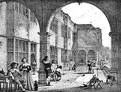 Numerous paintings and prints depict games and social events taking place on the lawn; one such painting by Joseph Nash, now in the National Fencing Museum, depicts 17th-century rapier practice, with a number of upper-class men, women and children as spectators.[22]