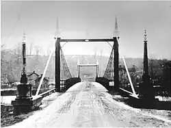 Until wagon bridges were built across the Little Miami River, settlement of Loveland was mostly confined to the Clermont County side, which had access to a railroad station.[3][4] A wooden bridge spanned the river at Symmestown and what would become Branch Hill from 1850 until it washed out six years later.[5] For years, residents on both sides pushed for a bridge at Loveland, to avoid the long trip to Foster's Crossing or Miamiville, and by 1868 threatened to have Miami Township annexed to Hamilton County if Clermont County officials continued to obstruct the project.[6] A $75,000 suspension bridge was finally built at Symmestown and Branch Hill and dedicated on July 4, 1871. It was anchored by four 7,000-pound (3,200 kg) wrought iron columns, at that time the heaviest ever made in the United States.[5]