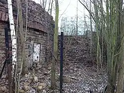 The theatre was designed by Ludwig Moshamer and placed on a site abutting the existing assembly field, roughly extending its semi-circular shape with a parabolic amphitheatre (rather than the oval of most of the Nazi arenas). The stage area was on three levels and extended into and was easily reachable from the audience area; the upper stage area was formed by a building, whose rounded rear wall extended into the field like an apse so that it could also serve as a speaker's tribune for gatherings there. Within this building were the dressing rooms and also in the centre a hall of honor for workers (the erste Ehrenmal der Arbeit, first monument to labour; the arena itself was officially the erste Thingstätte des Reiches, first Thing site of the Reich). (In fact the arena at Heringsdorf was begun first, in early February 1934, and also dedicated that May Day, but the official designation of Thingplatz was withheld from it until later, perhaps so as not to overshadow the Brandberge site.)[8] Financed and built by the German Labour Front, the hall of honour opened onto the assembly field and was intended to symbolise that "art in actuality belongs to the people".[9] It was made of porphyry and contained six larger than life sculptures by Alfred Vocke in rhyolite from Löbejün depicting different kinds of workers: a labourer, a farmer, a researcher, a miner, a smith and an ironworker,[10] and an eternal flame for which a gas line was specially installed. The stage above was also defined by two pillars resembling altars and surmounted by braziers which were ignited during performances.[9] Moshamer's original design, prepared in January 1934, had been for 5,500 seats; this was reduced to 5,050, in the form of benches. Amplification was not installed, but was temporarily added for the first performance, of Kurt Heynicke's Neurode. The slope into which the theatre was built originally had very few trees, but many were planted on both sides to enclose it.[11]