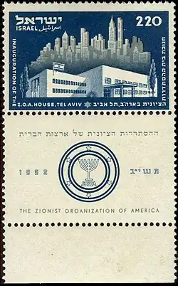 Israeli stamp commemorating the inauguration of the Z.O.A. House in Tel Aviv
