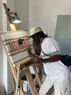 His debut U.S. solo exhibition, BIG WORDS, included painting, print, and fashion design, and was curated by Anna Cerniglia and Alison Cuddy for Blanc Gallery.[16][17][18] In a review for Dazed, Vanessa Murrell noted the exhibition's use of typography and figures to stimulate the viewer's right and left brain functions.[19]