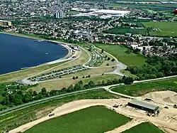 ![]() Brands Hill from the air in 2014, with the Queen Mother Reservoir on the left. | |
