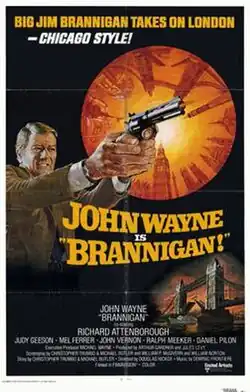 Brannigan (also known as Joe Battle) is a 1975 action thriller film directed by Douglas Hickox,[1] and starring John Wayne, Richard Attenborough and Judy Geeson. [2] Set principally in London, the film is about a Chicago detective (Wayne) sent to Britain to organise the extradition of an American mobster, who is soon kidnapped and held for ransom. Struggling with the restrained policing style of his British counterparts, the tough American detective uses his own brand of law enforcement to recapture the criminal.