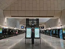 The station serves the Circle line, situated between the Dhoby Ghaut and Esplanade stations. The official station code is CC2.[16] The station operates daily between 5:39 am (6:06 am on Sundays and Public Holidays) and 12:03 am.[17] Train frequencies varies from 5 to 7 minutes depending on peak hours.[18] Bras Basah station has an unpaid link to the nearby Bencoolen station on the DTL.[19]