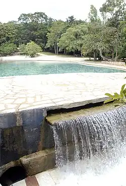The terrain is an undulating plateau with geological formations of quartzites and limestones. It has many caves and several springs. Apart from the springs, the source of water supply to the park is also through a reservoir.[3] The most prominent features of the park are the pools formed from water wells. Several creeks flow through the park, including the Bananal, Torto, and Santa Maria Creeks. Because of the large number of springs, its nickname is Agua Mineral (mineral water); the water is reported to have healing properties.[5] There are many trekking trails through the park.[6]