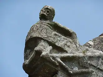 The Brasparts Parish close (Enclos paroissial) is located at Brasparts within Brittany's Châteaulin arrondissement in north-western France. The church is named the Église paroissial Notre-Dame-et-Saint-Tugen. Building started in 1551, a date which appears over the church's west door. The church is often called the "Église de Brasparts"' and is a listed historical monument since 1914.[1] The church is dedicated to the Virgin Mary and Saint Tugen, the Breton saint, and is for the most part built in the Gothic style. It has a double galleried "léonard" style bell-tower with a conical side tower which contains a stairway to access the bells. The porch has statues of the twelve apostles. The north window of the choir dates to 1543. Two niches in the choir area depict the parish's two saints and protectors, the Virgin Mary and Saint Tujan or Tugan.[2][3][4]