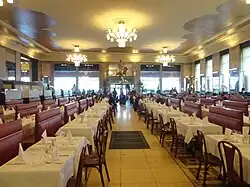 The Brasserie Georges is a restaurant located in the 2nd arrondissement of Lyon. It is the oldest brasserie in the city and one of the largest brasseries in Europe.[1] Its reputation is now international. With a history closely linked to that of Lyon, the brasserie serves typical dishes including the famous sausage of Lyon with pistachios, and recipes from other regions such as sauerkraut, baked Alaska or the seafood on their menu.[2] In 1986 the brasserie served the biggest sauerkraut in the world; it weighed a ton and a half. In 1996, the largest baked Alaska (34 metres) was served. The Brasserie Georges brews its own beer, a tradition from its inception, when water in Lyon was considered of exceptional quality. The restaurant never closes throughout the year. Over 700 guests can be served at each service.[3] On 8 December, during the fête des lumières, over 2,500 meals were served in a service. It is sometimes called the BG or Le Georges.