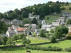 The Norman church, repaired and enlarged in the 19th century, stands on the north side of the steep valley in which the village lies. There were formerly three Nonconformist chapels, two of which are now closed and one demolished. The former Congregational chapel, at the northern entrance to the village, is now the village hall; the Primitive Methodist chapel, built by its members in 1834 above the church on the hillside, is a private house; the Wesleyan Reform chapel, at the west end of the village, was demolished in 2007. A house built on the site incorporates a plaque formerly set high on the chapel's frontage and a brass commemorative plate. In addition to the village hall, a meeting place was provided in the 1990s by a British Legion building in the village centre. There are two pubs, the Olde Gate (where Bonnie Prince Charlie’s soldiers were billeted on their march to London and some of the oak beams came from ships of the Spanish Armada[4]) which has a 1616 datestone and a largely 19th-century interior, and the Miners Arms, which was modernised thirty years ago, and which was once the venue for the manor court and the lead miners' Barmote Court. The school was built in 1872, after the passing of the 1870 Education Act, and is now a primary school.