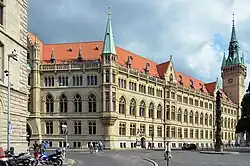 On 8 November 1918, at the end of World War I, a socialist workers' council forced Duke Ernest Augustus to abdicate.[30][31] On 10 November, the council proclaimed the Socialist Republic of Brunswick under one-party government by the Independent Social Democratic Party of Germany (USPD); however, the subsequent Landtag election on 22 December 1918 was won by the Majority Social Democratic Party of Germany (MSPD), and the USPD and MSPD formed a coalition government.[32] An uprising in Braunschweig in 1919, led by the communist Spartacus League, was defeated when Freikorps troops under Georg Ludwig Rudolf Maercker took over the city on order of the German Minister of Defence, Gustav Noske.[33][34] An MSPD-led government was subsequently established; in December 1921, a new constitution was approved for the Free State of Brunswick, now a parliamentary republic within the Weimar Republic, again with Braunschweig as its capital.[35]