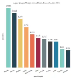 A total of 102,156 of Braunschweig's residents, including citizens with second passport, had a migration background in 2024 (37.5% of the total population). People from over 175 nations live in Braunschweig, contributing to its cosmopolitan atmosphere and demographics. Among the 37.5% of people with a migration background, 26% or 70,828 were Non-German citizens or Germans with a second passport but without a migration background [67]. A high proportion of foreigners in the city come from Asia and Africa, something not seen in many cities in a similar size range. One of the main asylums, for refugees and asylum seekers, of Lower Saxony is located in Braunschweig as well as multiple smaller asylums are present throughout the city too, contributing to a higher amount of migrants and refugees in the city compared to other parts of the state though a high number of them are not counted as residents.[68] The city's universities and interest in increasing the number of families from foreign countries has led to a higher trend in immigration. Braunschweig has had a relatively stable population because of multiple housing restrictions and other factors but many Germans are leaving the city so in order to take up their spaces, many foreigners are coming to the city. Multiple residential areas are being constructed in order to withstand the high inflow of migrants to the city.