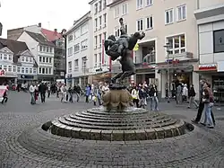 During the Middle Ages, Brunswick was an important center of trade, one of the economic and political centers in Northern Europe and a member of the Hanseatic League from the 13th century to the middle of the 17th century.[18] By the year 1600, Brunswick was the seventh largest city in Germany.[19] Although formally one of the residences of the rulers of the Duchy of Brunswick-Lüneburg, a constituent state of the Holy Roman Empire, Brunswick was de facto ruled independently by a powerful class of patricians and the guilds throughout much of the Late Middle Ages and the Early modern period. Because of the growing power of Brunswick's burghers, the Princes of Brunswick-Wolfenbüttel, who ruled over one of the subdivisions of Brunswick-Lüneburg, finally moved their Residenz out of the city and to the nearby town of Wolfenbüttel in 1432.[20] The Princes of Brunswick-Wolfenbüttel did not regain control over the city until the late 17th century, when Rudolph Augustus, Duke of Brunswick-Lüneburg, took the city by siege.[21]