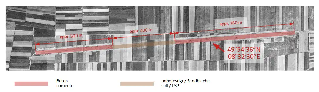 Braunshardt Airfield's origins begin as a 5500x150' concrete landing strip laid down 09/27 by the Luftwaffe, probably in late 1944 as an emergency landing airfield just to the south of Worfelden, in a series of wheat fields. There are no records of any use by the Luftwaffe of the airfield.[1] The IX Engineering Command 832d Engineering Aviation Brigade moved into the area on 27 March 1945 and enabled the strip to become a combat resupply and casualty evacuation field, designating it as Advanced Landing Ground "Y-72". The 850th EAB then expanded the facility, adding an extensive set of dispersal pads and taxiways using Pierced Steel Planking and enabling it to be used as a combat airfield.[2]