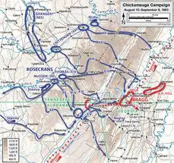 In early August, the Confederate War Department asked Bragg if he could assume the offensive against Rosecrans if he were given reinforcements from Mississippi. He demurred, concerned about the daunting geographical obstacles and logistical challenges, preferring to wait for Rosecrans to solve those same problems and attack him.[47] An opposed crossing of the Tennessee River was not feasible, so Rosecrans devised a deception to distract Bragg above Chattanooga while the army crossed downstream. Bragg was rightly concerned about a sizable Union force under Maj. Gen. Ambrose E. Burnside that was threatening Knoxville to the northeast, and Rosecrans reinforced this concern by feinting to his left and shelling the city of Chattanooga from the heights north of the river. The bulk of the Union army crossed the Tennessee southeast of Chattanooga by September 4, and Bragg realized that his position there was no longer tenable. He evacuated the city on September 8.[48]