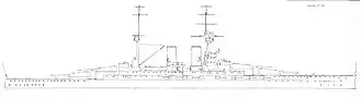 After the commissioning of the battleships Minas Geraes and São Paulo, Brazil began to experience severe economic difficulties caused by the decrease in coffee and rubber exports, in addition to the crisis in its navy due to the Revolt of the Lash, and the European economic recession caused by the Second Balkan War, which prevented the country from contracting new foreign loans.[3] This prompted the Brazilian government to sell the still-under-construction battleship Rio de Janeiro to the Ottoman Empire in 1913 for £2.75 million.[4] With the money, the country asked Armstrong and Vickers shipbuilders for projects for a new battleship,[5] since Brazil did not want to fall behind other South American countries such as Argentina and Chile, all involved in a naval arms race at that time.[6]