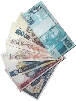 There have been nine different units of Brazilian currency in sequence over the country's history:[1][2][3][4][5] the Portuguese and first Brazilian real (plural réis); 3 different types of cruzeiros; the cruzado; the novo cruzado; the cruzeiro real, and since 1994, the second incarnation of the Brazilian real (plural reais), with the symbol R$ and the ISO codeBRL.