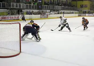 A breakaway is a situation in ice hockey in which a player with the puck has no defending players except for the goaltender between him or her and the opposing goal, so is free to skate in and shoot at will (before the out-of-position defenders can catch up). A breakaway is considered a lapse on the part of the defending team. If a player's progress is illegally impeded by an opposing player or if the goalie's stick is thrown forward, the breakaway player is awarded a penalty shot. If a player faces an empty net (i.e., the opposing team has pulled their goalie) and is illegally impeded by an opposing player, he or she is automatically awarded a goal instead of taking a penalty shot.