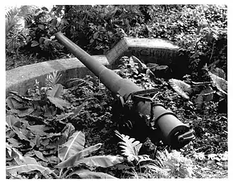 The Breakers Point Naval Guns are a historic World War II-era defensive fortification on the island of Tutuila in American Samoa. It consists of two 6-inch (150 mm) Mark 8 Model 2 naval guns, mounted on circular concrete platforms about 200-foot (61 m) above sea level at the end of Papatele Ridge, which flanks the east side of Pago Pago Harbor. The guns, manufactured in 1907, were emplaced in 1941 amid fears of a Japanese invasion of the island, and were left in situ (albeit disabled) after invasion fears subsided. They were brought to the site by an innovative railway system that used locally crafted rails fashioned out of ifil wood when steel rails were not available.[2] The guns are located on private family-owned land, but may be hiked to with permission.