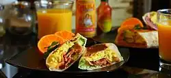 The breakfast burrito (Spanish: Burrito de desayuno), sometimes referred to as a breakfast wrap outside of the American Southwest,[1] is a variety of American breakfast composed of breakfast items wrapped inside a flour tortilla burrito. This style was invented and popularized in several regional American cuisines, most notably originating in New Mexican cuisine, and expanding beyond Southwestern cuisine and neighboring Tex-Mex. Southwestern-style breakfast burritos may include any combination of scrambled eggs, potatoes, cheese, peppers (usually New Mexico chile, Jalapeño, or other chili peppers), salsa, onions, chorizo, bacon, or sour cream.[2] In other variations of breakfast burritos, more ingredients such as tomatoes, cheese, ham, and other fresh products can be added.[3]