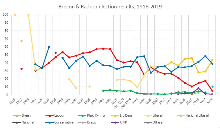 The constituency was created in the boundary changes of 1918 by merging Breconshire and Radnorshire, both previously constituencies in their own right. As part of the Third Periodic Review of Westminster constituencies there were changes to the boundaries in 1983, when the constituency lost several small areas in the south.[7] While historically having been held by the Labour Party for forty years, the constituency was captured from the Conservative government by the SDP–Liberal Alliance at a dramatic by-election in 1985. It was regained by the Conservatives in 1992, taken back by the Liberal Democrats in 1997, and then returned to the Conservatives in 2015. It was the Conservatives' fifteenth target seat at the 2005 election, but the party's share of the vote fell, leaving it as the Conservatives' 95th target seat in 2010, requiring a swing of 5.09%. In the event, the swing to the Conservatives was 0.3%, and the Liberal Democrats retained the seat, with Roger Williams remaining the MP. In 2015 the seat was reclaimed for the Conservatives by Chris Davies, whose majority of 5,102 was the largest in the constituency since Tom Hooson won the seat, also for the Conservatives, in 1983. Roger Williams stood for the Liberal Democrats in 2015 but shed over 6,500 votes from his 2010 result, a loss of 17.8%.