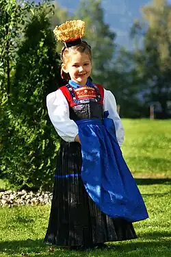 The Bregenz Forest traditional costume, locally called Juppe after the pleated skirt, the main component of the costume, is a women's traditional costume from the Bregenz Forest, a region in the western Austrian state of Vorarlberg. In its original form, the oldest traditional costume in the Alpine region. The history of the Juppe goes back to the late 15th century.[1] The traditional costume is worn by women on festive occasions, such as for weddings, and on Sundays for mass in church. The elaborately embroidered traditional costume, as well as its multitude of accessories, is individually tailored by hand in the Juppenwerkstatt Riefensberg. The precious garment often accompanies the Bregenzerwald woman throughout her life and is usually passed down in the family. A striking feature of the traditional costume is the glued pleated skirt, which has 500 to 600 pleats.