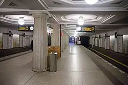 The hall ceiling is designed as a coffered ceiling supported by granite-faced Doric pillars in the center of the platform. The cassettes contain octagonal mosaic panels with geometric patterns. Through four elliptical openings daylight falls on the today with granite, originally occupied with asphalt plates platform.