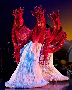 Aoki's multidisciplinary performances combine Japanese Noh, Kyogen Theater, Commedia dell'arte, movement and voice. She uses dance, music and theater with few props, exaggerated movements, and simple sets.[21] She has performed in such as venues the Kennedy Center, New Victory Theater on Broadway, Hong Kong Performing Arts Center, the Adelaide International Festival in Australia, the Esplanade in Singapore, the Graz Festival Austria and the International House in Tokyo. Aoki's plays have been produced worldwide: Mermaid, a work for symphony, was commissioned by Maestro Kent Nagano, The Queen's Garden was published by Routledge Press and produced at the San Diego Repertory Theatre, Uncle Gunjiro's Girlfriend was the American representative to the Adelaide International Festival, Australia, Random Acts was produced by the Dallas Theater Center, Kuan-Yin: Our Lady of Compassion, a dual commission between Hong Kong and San Francisco.[3]