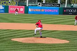 Donnelly was an immediate fan favorite because of his intensity, his goggles, and his effectiveness as the main setup man to Troy Percival.[10] Donnelly would play an integral part of the Angels' bullpen during their playoff run in 2002. After struggling in the ALDS and ALCS, Donnelly excelled in the World Series against the San Francisco Giants, allowing zero runs in five appearances (7+2⁄3 innings, four walks, six strikeouts).[2] He was also the winning pitcher in Game 6, tossing a scoreless eighth inning in Anaheim's 6–5 win.[11] In the decisive Game 7, Donnelly tossed two scoreless innings while striking out two batters, helping the Angels to their first World Series title.[12]