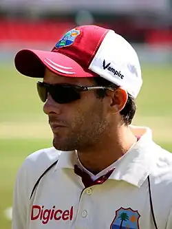 Nash made his Test debut for the West Indies on 11 December 2008, playing against New Zealand. In the same match, fast-bowler Lionel Baker also made his debut.[24] It was widely reported in the media that he was the first white man to play for the West Indies since Geoff Greenidge played five Tests in the early 1970s.[25] He was subjected to racial abuse for being a "white boy" during trials for Jamaica.[26] Chris Gayle, Jamaica's captain, helped Nash telling him that "You are one of us, don't worry about what anyone's saying to you. If anyone troubles you, I am here for you."[27] It later emerged that he was of mixed race.[26] He took his first Test wicket in the third Test against England when Matt Prior was caught by Shivnarine Chanderpaul off Nash's bowling.[28] During the fifth Test in Trinidad Nash scored his maiden Test century, his innings of 109 included 17 fours. He shared a 234-run fifth wicket partnership with Chanderpaul. Nash continued his good form in the first Test against England with 81 during a 143-run partnership with Denesh Ramdin who made 61.