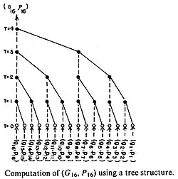 The design of the white nodes is obvious as they are just buffering the gi's and pi's, and the black nodes are performing operation defined by operator ○, which is similar to a one bit adder.