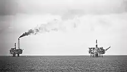 Production started on 11 November 1976, and on 13 December 1976 the first tanker was loaded. The Brent field oil was extracted by four platforms in an irregular SSW-NNE line.[7] The first in place was the concrete-legged "Condeep" Brent Bravo, built by Norwegian Contractors in Stavanger, in August 1975. This was followed by the steel-jacket Brent Alpha built by Redpath Dorman Long in Methil and installed in May 1976; the concrete-legged Brent Delta, again built by Norwegian Contractors in Stavanger, in July 1976; and the concrete-base Brent Charlie, built by McAlpine/Sea Tank in Ardyne Point, installed in June 1978.[8] As of 2004, the field was still producing oil through a manifold (all Brent Alpha fluids are produced across to Brent Bravo). A fifth installation, the floating Brent Spar, served as a storage- and tanker-loading buoy and was installed early in the field's construction. The "spar" design of this installation led to the name by which it became the best known of the Brent installations (outside the oil industry). The field also included a remote flare, the "Brent Flare", which was used to flare off excess gas before gas handling and export facilities were installed in the field, also used as a vent in winter 1995–96. This unit was decommissioned and removed using a heavy lifting barge in 2005.[9]