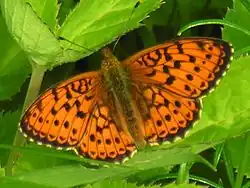 Brenthis ino is a medium-sized butterfly with a wingspan of 34–42 millimetres (1.3–1.7 in). Females are larger and usually darker than males. The antennae are clavate (club shaped). The basic color of the upper side of the wings is orange with several dark brown blotches. The edges are brown too, with a discontinuous stripe of small blotches. The lower side of the wings is creamy orange with an indented edge and dark brown blotches on the forewings, while the hindwings show brown-edged beige blotches and some ringed dark brown and violet shading spots. The wings of this species lacks any silver blotches. The butterfly flies from June to August depending on the location. It overwinters in the form of caterpillar. The larvae feed on meadowsweet (Filipendula ulmaria), dropwort (Filipendula vulgaris), stone bramble (Rubus saxatilis), raspberry (Rubus idaeus), Aruncus species, Spiraea species and salad burnet (Sanguisorba minor).[1]