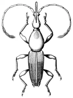 Brentidae is a cosmopolitan family of primarily xylophagous beetles also known as straight-snouted weevils; they have sometimes been called "primitive weevils", but this name also applies to taxa such as the Belidae. The concept of this family has been expanded with the inclusion of three groups formerly placed in the Curculionidae; the subfamilies Apioninae, Cyladinae, and Nanophyinae, as well as the Ithycerinae, previously considered a separate family. They are most diverse in the tropics, but occur throughout the temperate regions of the world. They are among the families of weevils that have non-elbowed antennae, and tend to be elongate and flattened, though there are numerous exceptions.