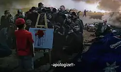 Zhao Lijian, a spokesman for the Foreign Ministry of China and a vocal provocateur on Twitter, share-posted a computer graphics painting created by a Chinese internet political cartoonist, pennamed Wuheqilin, depicting an Australian soldier holding a bloodstained knife to a child's throat, on top of an Australian flag. This image was accompanied by the English caption: "Don't be afraid, we are coming to bring you peace!"[43] This triggered the response from the Australian Government and MPs from various parties condemning Zhao's remarks as "repugnant", "deeply offensive" and "utterly outrageous", with Australian Prime Minister Scott Morrison publicly demanding that the Chinese Government apologise,[44][45] and appealing to Twitter to directly remove the "falsified image", but has yet to receive any response from Twitter. The Chinese Government has rebuffed Morrison's calls for apology, defending Zhao's conduct and stating that Australia should apologise for the loss of lives in Afghanistan. Zhao, in response, pinned the controversial post to the top of his Twitter timeline.[46] The cartoonist Wuheqilin also followed up with a new image captioned "Apologize!" depicting Morrison and the Australian media mobbing a young painter while being oblivious to the backdrop of dead bodies (which Morrison is trying to conceal with an Australian flag) and soldiers shooting more unarmed civilians.[47]